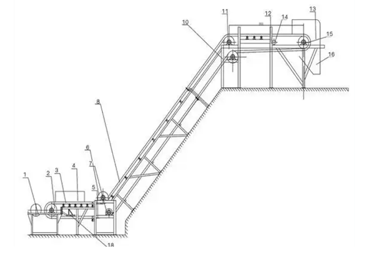 大傾角皮帶輸送機主要由波狀擋邊輸送帶、驅動裝置、傳動滾筒、改向滾筒、壓帶輪、托輥、托帶輥、立輥、拍打輪清料裝置、拉緊裝置等部分組成。大傾角皮帶輸送機其結構是在平形橡膠運輸帶兩側粘上可自由伸縮的橡膠波形立式“裙邊”,在裙邊之間又粘有一定強度和彈性的橫隔板組成匣形斗,使物料在斗中進行連續輸送。